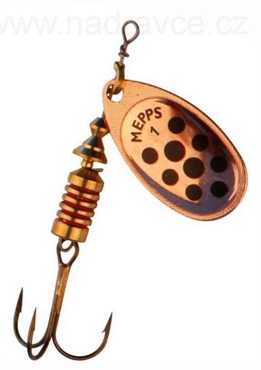 Mepps Aglia Decore, černé tečky vytvářejí při vláčení atraktivní odrazy, které lákají hlavně okouny a štiky na stojatých vodách, rybnících a jezerech. Na tekoucích vodách hlavně Jelce.